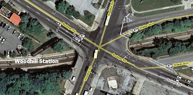 From here, the right of way continues to follow a former railway right of way to the Woodhill station. At this point, the line is traveling east. At the east end of the station, the line passes under the intersection of Buckeye Road, Woodhill Road, and Shaker Boulevard (see image to the left).