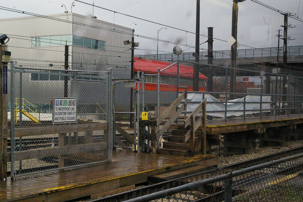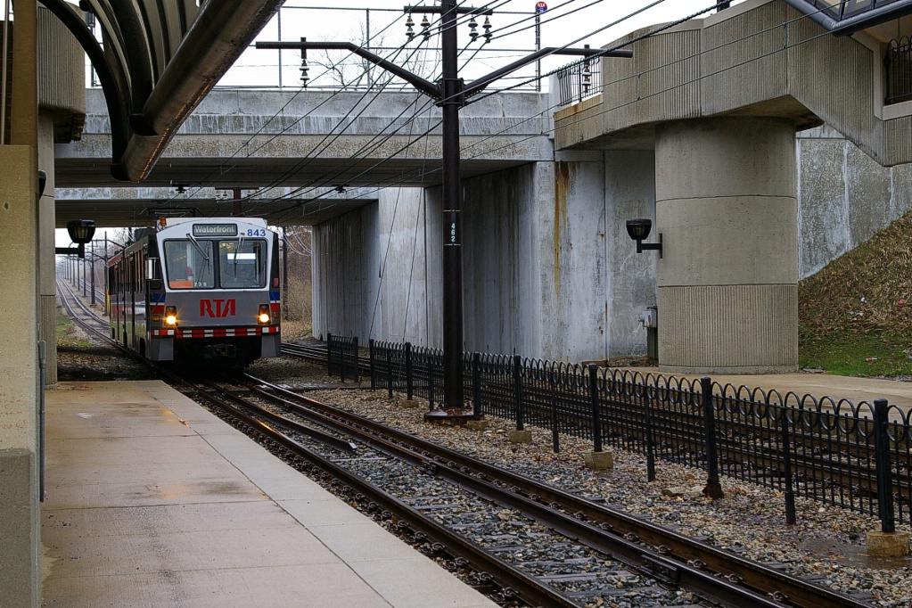 Further to the southwest is West 3rd Street, the station that serves the Cleveland Browns Stadium. West of this station, the line passes under West 3rd Street and crosses a grade crossing with a railway spur (see photo to the right).