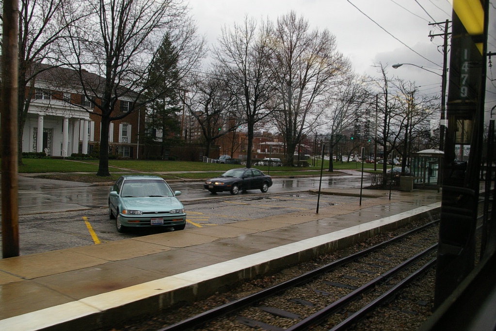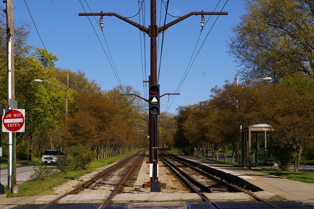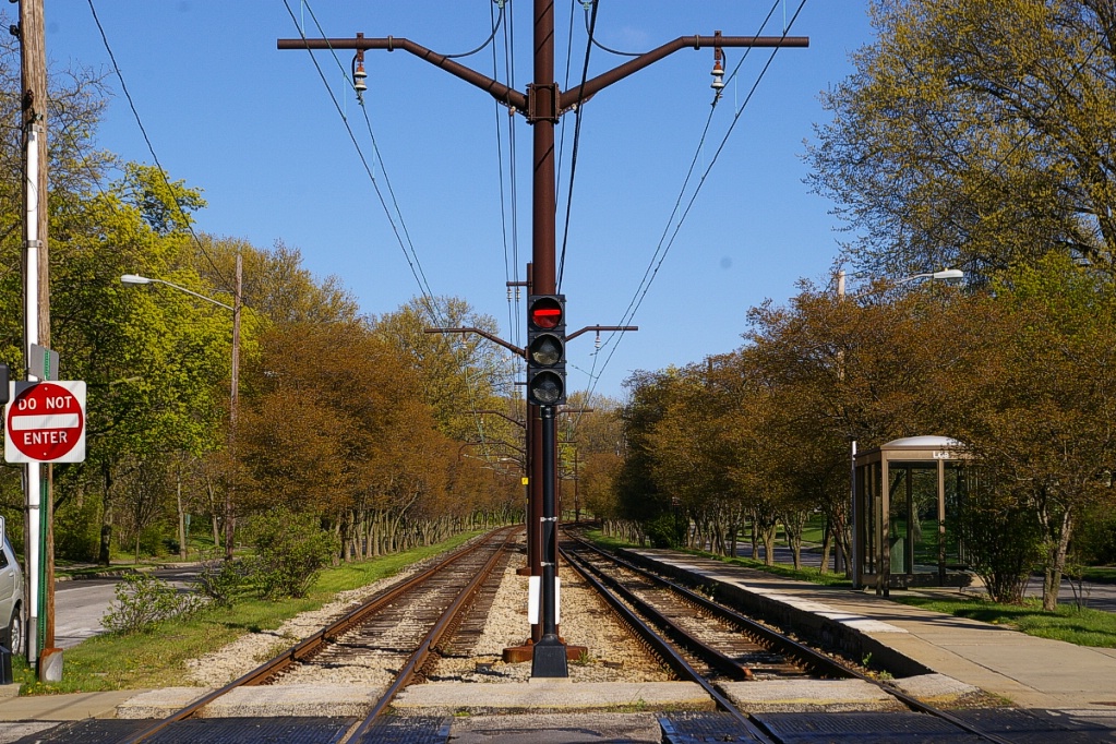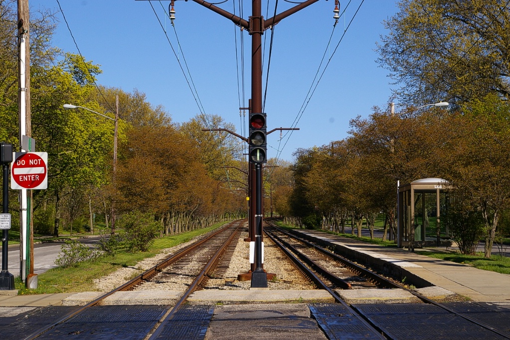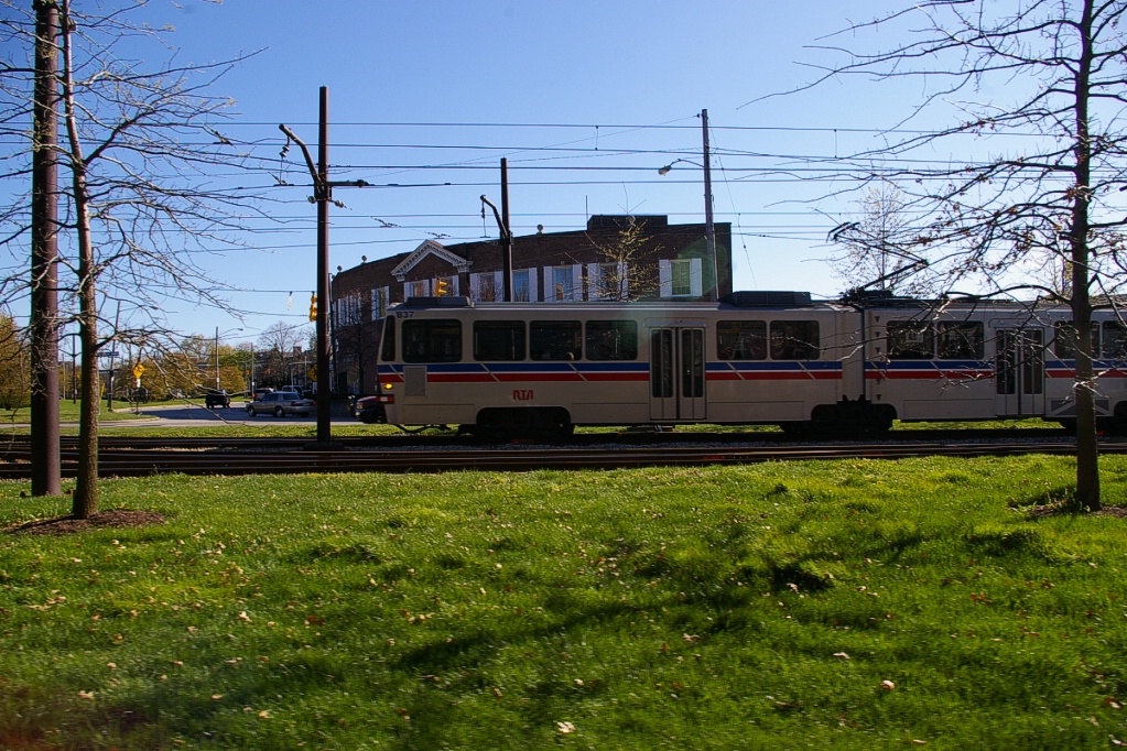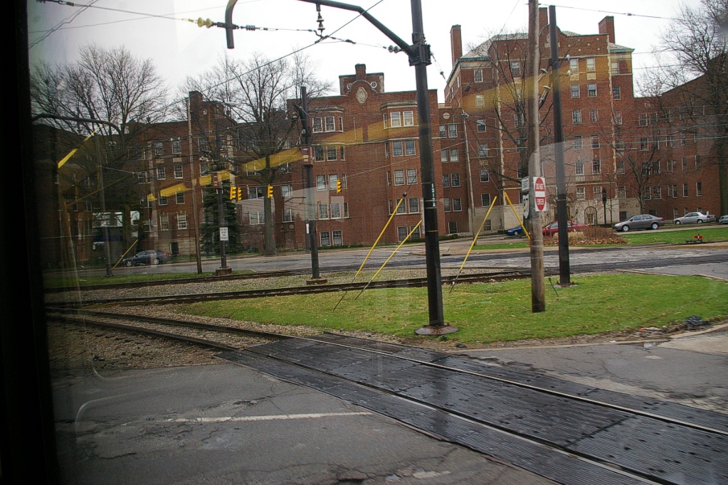 East of the junction at Shaker Square, there is a centre pocket track for a short distance to hold a train if needed. The line proceeds along a wide median on Shaker Boulevard that, for the most part, has mature trees that partially obscure the LRT from vehicle traffic.