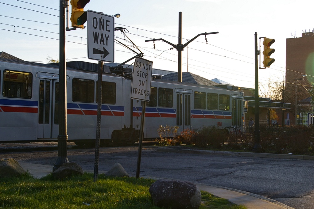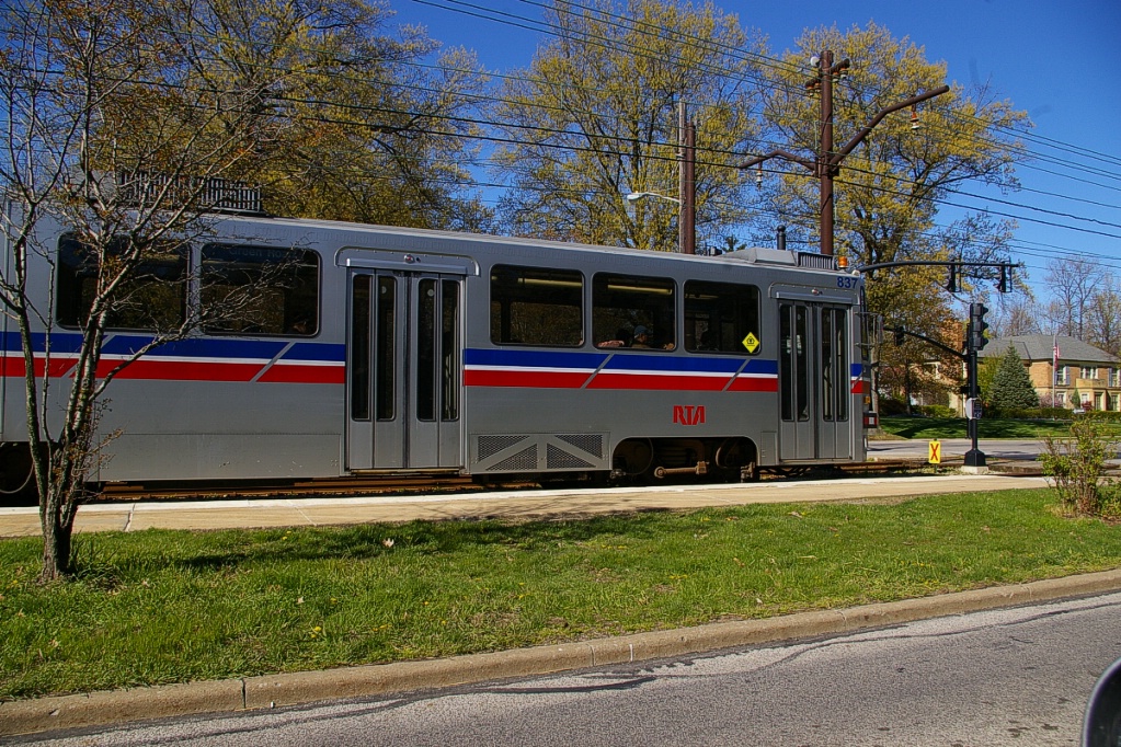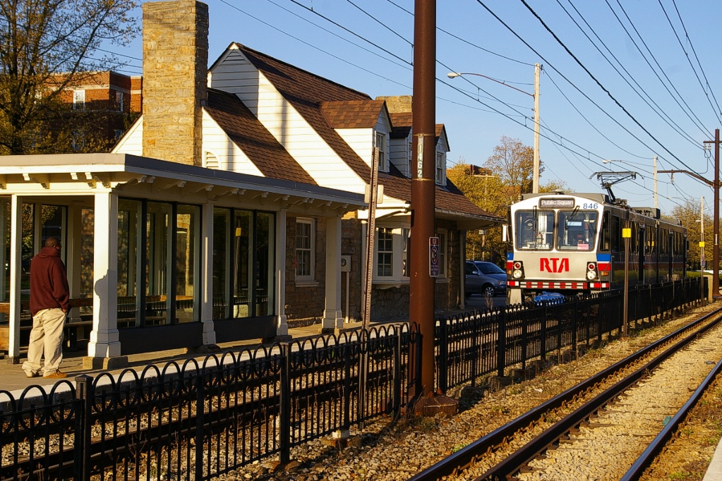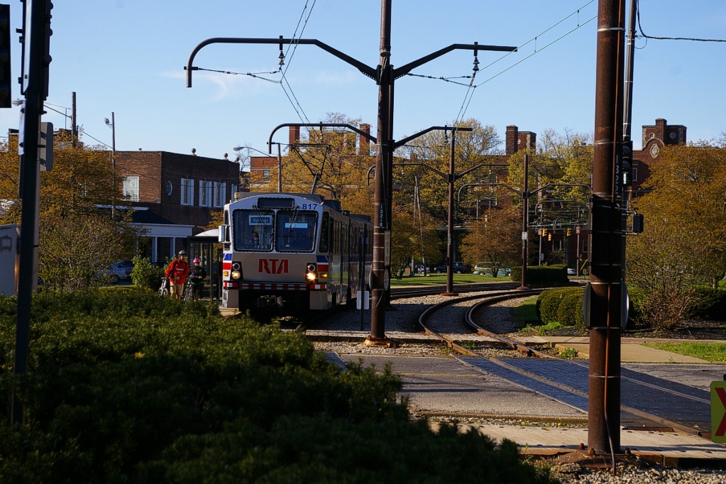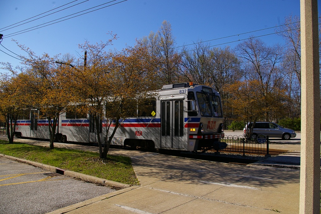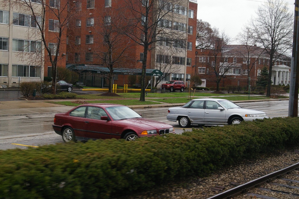 East of the junction at Shaker Square, there is a centre pocket track for a short distance to hold a train if needed. The line proceeds along a wide median on Shaker Boulevard that, for the most part, has mature trees that partially obscure the LRT from vehicle traffic.