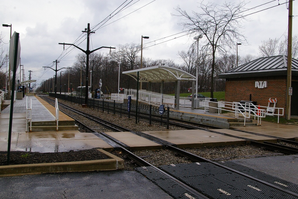 Each side of Shaker Boulevard converge slightly to become about 150 metres apart on the north and south sides of the ravine right of way. The first stop, almost 800 metres from Warrensville, is Belvoir. This stop has walk-in access from nearby residential neighbourhoods. Its platforms are slightly staggered with the outbound platform about one and a half LRV lengths further west than the inbound platform.